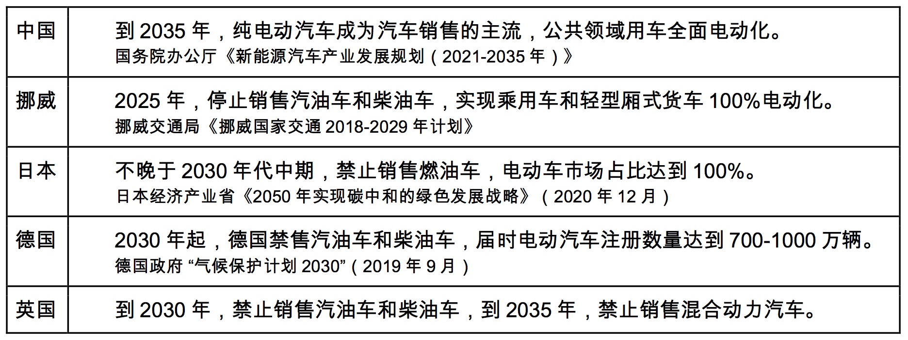 政策层面,全球多个国家陆续提出了实现碳中和的目标,其中交通领域的低碳化是实现总体碳中和目标的重要环节。挪威、德国、英国和日本等国家相继出台禁售传统燃料汽车的计划,中国、挪威和日本等国家也将发展电动汽车作为主要战略。