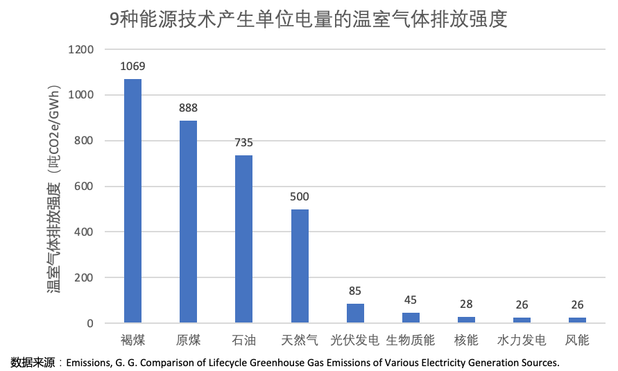 从下图可以看出,使用传统能源发电技术(煤、石油和天然气)要比使用可再生能源发电技术(光伏和风电等)的碳排放强度高数倍甚至数十倍。