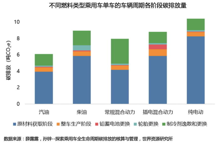 在上图的数据中,依据5种汽车全生命周期碳排放强度对比,可以发现纯电动汽车的全生命周期碳排放,的确比其他类型汽车略低,其中燃料周期的碳排放显著低于其他车种。但是,纯电动汽车在车辆周期的碳排放较高,无论是碳排放占比、还是绝对数值,都是5种汽车中最高的。车辆周期包括原材料获取、整车生产、维修保养等阶段。