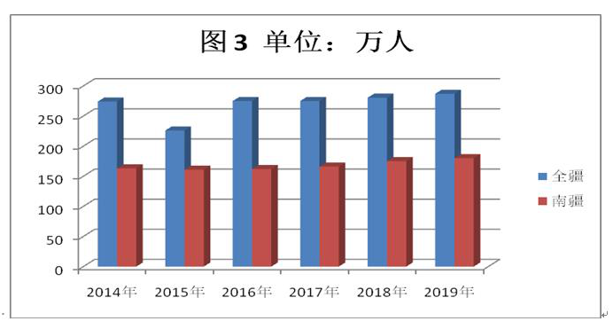 在政府帮助下,很多少数民族群众找到了满意的工作。据统计,2014年至2019年,全区农村富余劳动力外出就业1657万人次,年均276.2万人次,其中南疆1007万人次,年均167.8万人次(如图3)。
