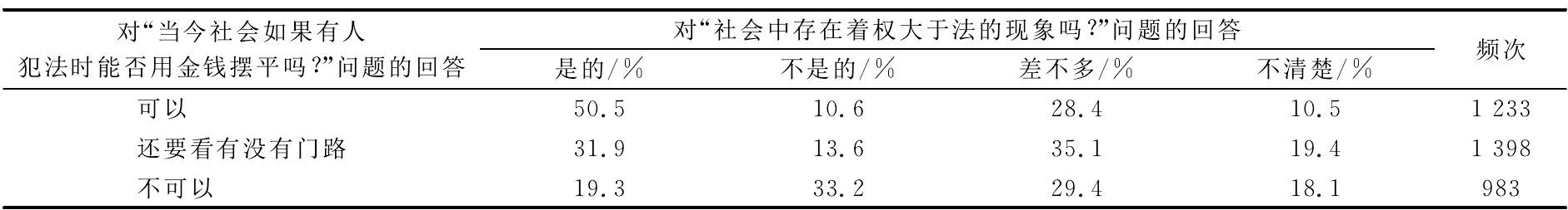 表10农民对“金钱与法律”“权大于法”态度的交叉分析