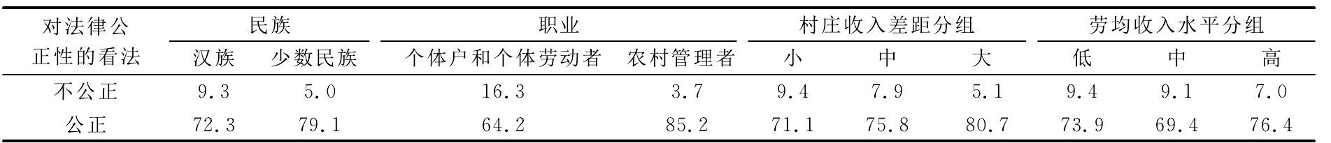 综合来看,以上4个方面的因素中,后2个方面都是与收入差距相关的,从这个角度看,农民对法律公正性观念的差异主要受到经济差距的影响。而这又可能通过第二个方面和第一个方面表现出来:其中,第一个方面虽然表面上体现为民族特性,但实际上也与经济状况之间有着直接的关系;第二个方面则与收入差距直接相关,但也可以概括为另外一种因素,即农民个体的社会身份,这在农村中特别表现在农村管理者与非管理者的区分上。
