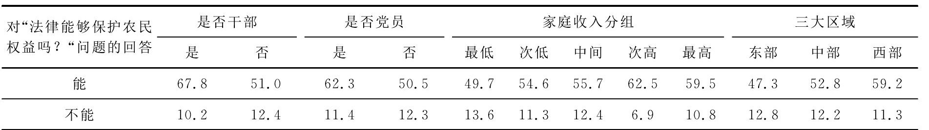 法律作为公民权益保护的直接保证,这一点在社会实践过程有着普遍性的体现,但在农民那里,则不乐观。1999年,任大鹏通过对全国16个省市自治区农民法律意识的问卷调查,得出的结论是,我国农民的法律保护意识比较差[1];时过境迁,韦留柱2008年对河南农村的调查表明,农民希冀通过法律维护自身权益的欲望有所扩张,但面对具体问题时对法律又望而却步[14];苗泽一在随后的理论分析中坚持认为,农民的法律意识不仅比较稀薄,而且还不懂得利用法律武器保护自己应有的权利[5]。在现实生活中,也经常看到一些农民权益得不到法律保护的案例,而这又特别表现在两个方面:一是与农民承包权益有关的,二是与失地农民利益相关的。但是,这些毕竟是特殊案例和少数意义上的,在一般意义和大多数意义上,农民则持肯定的态度。