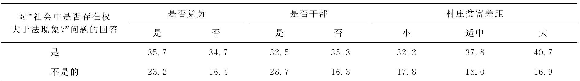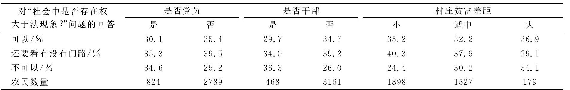 首先,农民的社会身份影响着他们对究竟是权大还是法大的认识。相比较于普通群众,党员和干部更相信社会中不存在“权大于法”的现象。原因可能基于他们自己身份所蕴含的机会与可能,也可能在于他们更加关注社会事件中的积极因素,还有可能在于他们在观念上的某种导向。但事实是清楚的,不论他们是否干部、是否党员,他们中大致相同比例的人认为,在社会中确实还存在着“权大于法”的现象。这说明,对这一不正常现象的非正常判断受到农民身份的影响,而对这一不正常现象的正常判断则不受到他们个体身份的影响。