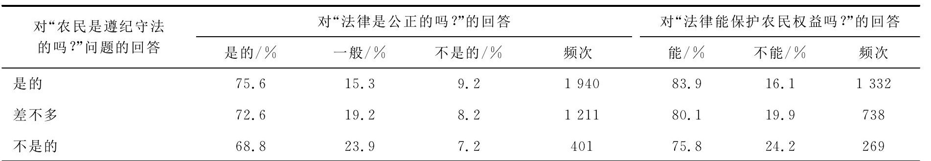 很明显,农民的守法意识直接决定着他们对法律公正性和权益保护性的评价。从表7可以看出,如果农民越是遵纪守法,越是相信法律的公正性,同时,也越是相信法律能够保护农民的权益。或者相反,农民越是相信法律的公正性,就越会遵守法律;在农民需要的时候,如果法律能够保障他们的权益,他们也就越会遵守法律。