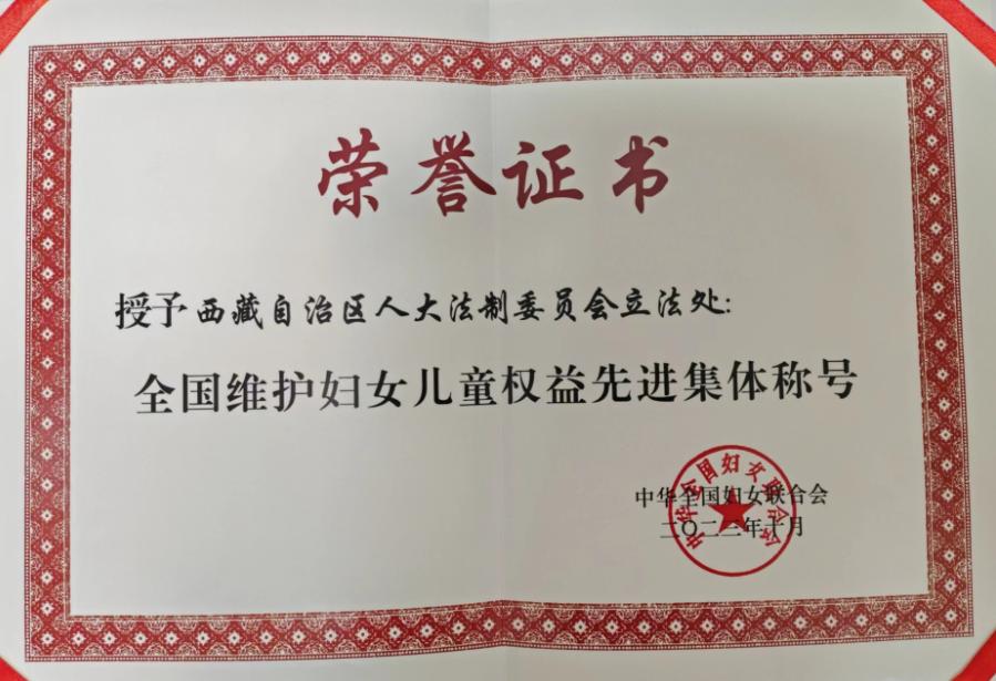 西藏自治区人大法制委员会立法处荣获“全国维护妇女儿童 权益先进集体称…