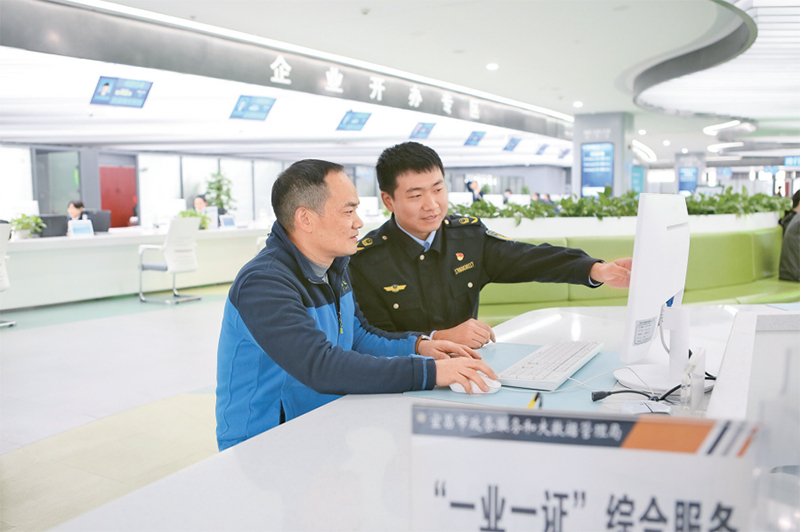 优化营商环境,是培育和激发经营主体活力、增强发展内生动力的关键之举。图为2023年11月27日,在湖北省宜昌市市民之家市场监管局窗口,工作人员指导企业人员在线办理企业登记注册业务。 湖北省宜昌市市场监管局供图