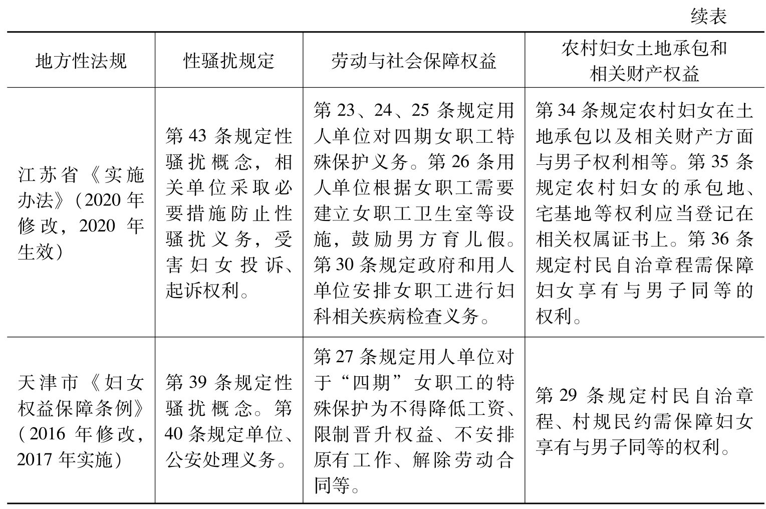 我国现有关于妇女权利保障的行政法规有《特别规定》等,相较《妇女法》等基本法,这些法规规章条款更为具体细致,司法适用性更强。同时,我国地方文化经济等差异决定了统一立法难以完全照顾到不同的地方具体情况,地方可根据上位法结合本地情况制定实施办法。地方立法一方面需要符合上位法的基本精神,在不与《妇女法》等上位法或行政法规相抵触的前提下,将国家有关制度和规定细化为更加符合地方实际,更具有针对性、可操作性、可执行性的条文。另一方面,各地实施办法修订工作应积极吸纳理论界最新研究和实务界最新探索,在立法模式、章节架构、制度创新方面可以作出比统一法更为大胆的尝试。但是,囿于上位法的滞后和辖制,下位规章和办法尝试创新和突破时又容易陷入整体优化乏力的困境,一定程度上对《妇女法》修订完善工作形成倒逼态势。地方创新性立法是满足地方发展需求,实现地方治理法治化的必由之路。地方为中央立法发挥先行先试、立法“试验田”的作用,为正式立法积累了经验、创造了条件,有助于完善社会主义法治体系。《立法法》为地方立法先行先试提供了法律依据。如下表所示,近年一些地方实施办法已经先行进行了修订,新增和更新内容主要集中在性骚扰防治、劳动与社会保障权益、农村妇女土地承包、其他财产权益等纠纷矛盾较多的四个方面。