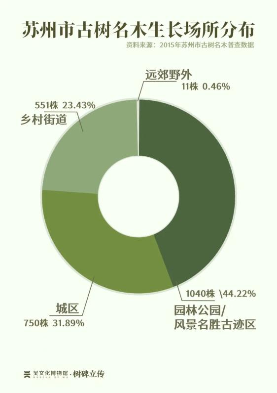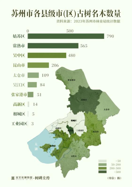 据2023年市林业站的统计,苏州全市现存2307株古树,其中一级古树(树龄≥300年)530株,二级古树(树龄100-299年)1777株。它们栽植在小巷深处的宅院、曲径通幽的园林,扎根于一望无垠的旷野、遗世独立的岛屿,亦生长在街头巷尾、桥头岸边,为每一位过路人遮风蔽日,与每一代苏州人相依相伴。那是“榆柳风轻客馆幽”的隽永风光,是“更历人间几百秋”的沧桑变迁,是“树色如得意,我亦成其趣”的悠然韵致,更是“今已亭亭如盖矣”的绵长情谊。