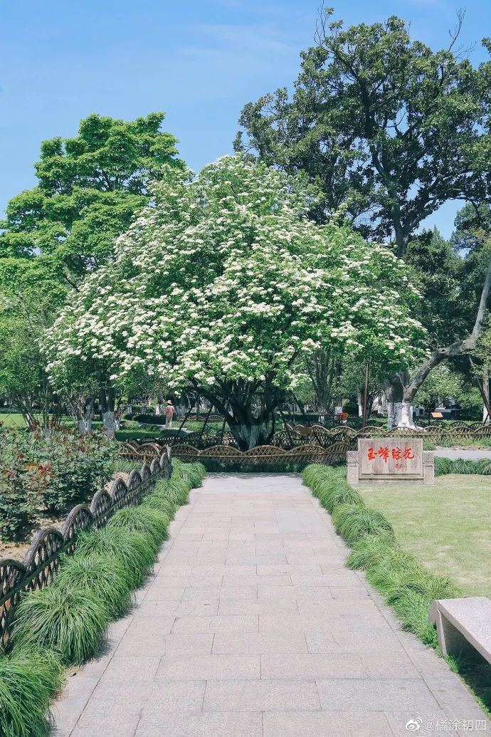 暮春时节,昆山亭林园的琼花绽出白色。古人说“天下无双独此花”,今天的亭林园种了不少琼花树,其中靠近东门的一株有310年树龄,树冠周整,繁花似雪,八朵五瓣大花簇拥着小花,似玉峰山下群蝶起舞,仙姿绰约。