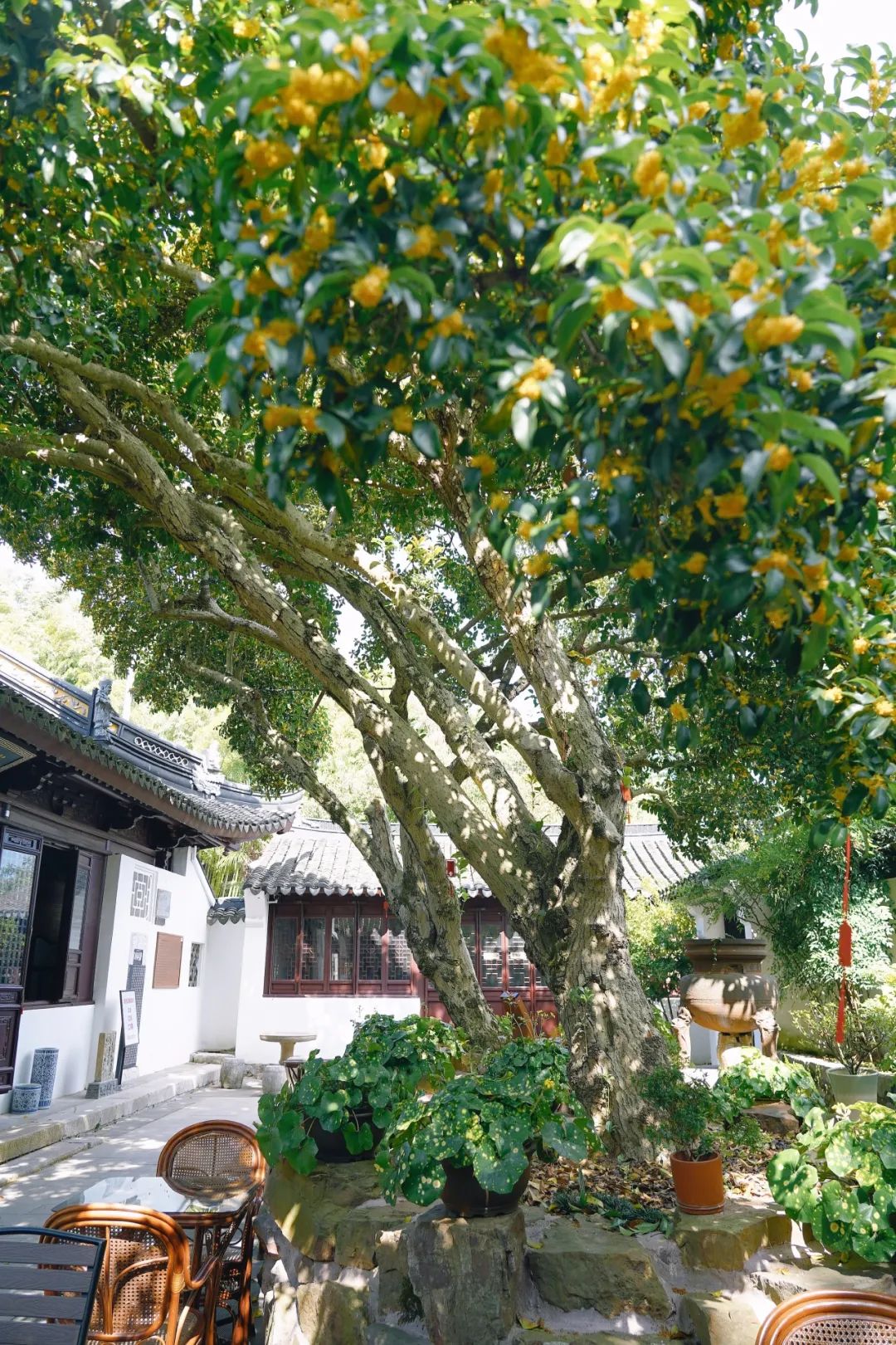 桂花是苏州的市花,开学典礼上固定的开场白“金秋九月,丹桂飘香”,是属于苏州小囡的共同记忆。东山紫金庵有三棵桂花古树,堂前的两棵金桂朝着罗汉堂方向倾斜,曾被解读为“虔诚礼佛”,如今系着祈福红丝带的桂花在茶室上方撑起一把大伞,又多了几分入世的意味。自明朝至今,多少人在树下来来去去,我们不知道对方是谁,却共同拥抱这一树花香。茶烟氤氲、香风细细之间,是600年的光阴流转。
