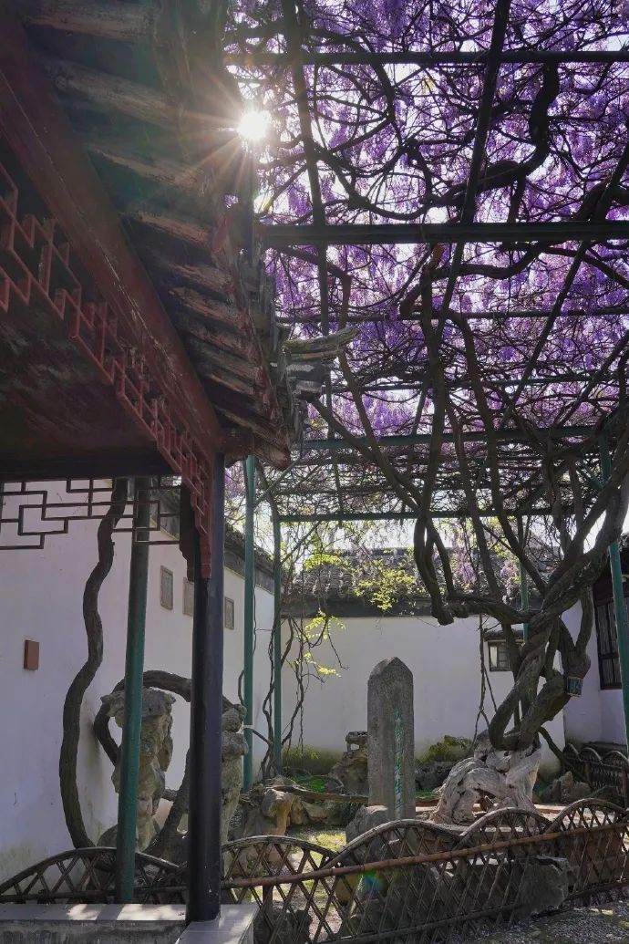 苏州博物馆忠王府中的紫藤盛名在外,“因为是文徵明的紫藤,便胜过了世间一切的紫藤。”明正德年间,文徵明在好友王献臣营建的拙政园中,亲手种下一株紫藤。400多年间,园林几次易主,如今与拙政园一墙之隔的苏州博物馆忠王府卧虬堂小院中,曲若虬龙的紫藤“蒙茸一架自成林”。四月暮春时,璎珞四垂,紫英缤纷,明代江南文人的园林雅集与今时的“偷得浮生半日闲”成为重影。