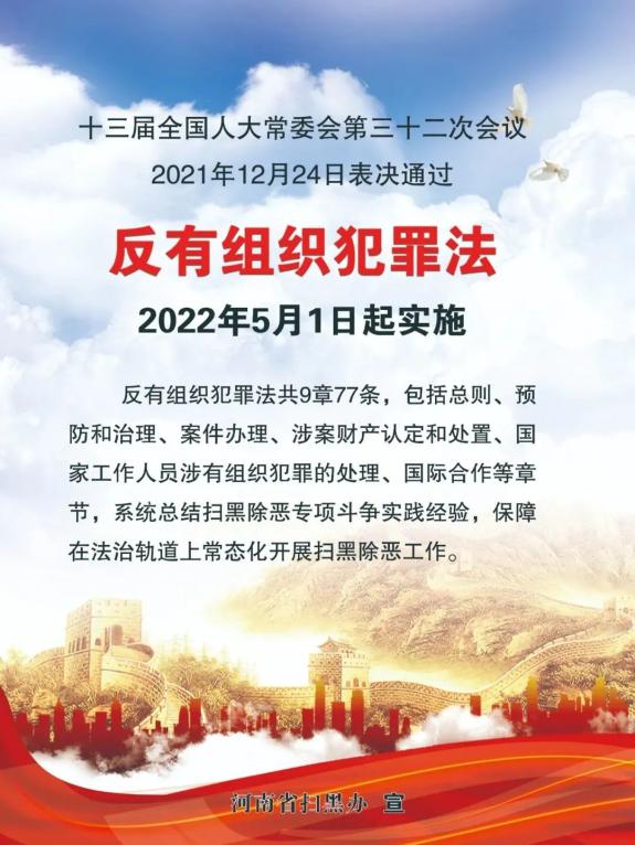 2021年12月24日,十三届全国人大常委会第三十二次会议表决通过《中华人民共和国反有组织犯罪法》,该法自2022年5月1日起施行。这部法律你了解多少呢?下面跟着“新乡政法”一起学习吧!