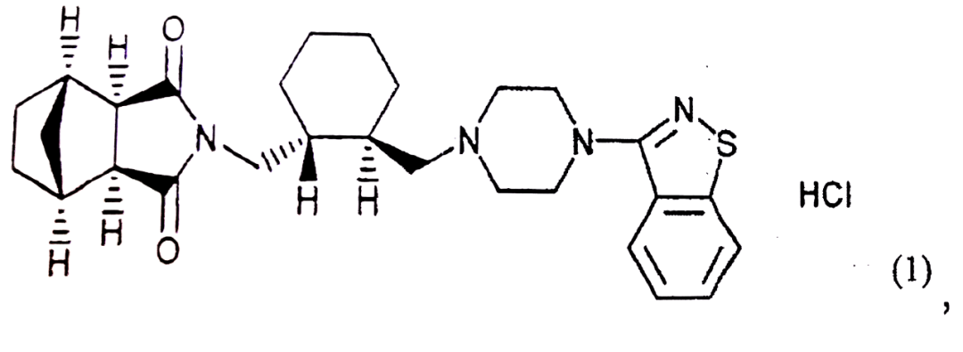 作为一新型非典型抗精神病药,lurasidone是该专利的有效成分,该专利权利要求1为:一种口服制剂,该制剂含有通式(1)所示的N-[4-[4-(1,2-苯并异噻唑-3-基)-1-哌嗪基]-(2R,3R)-2,3-四亚甲基-丁基]-(1’R,2’S,3’R,4’S)-2,3-双环[2,2,1]庚烷二酰亚胺·盐酸盐(lurasidone),预糊化淀粉,水溶性赋型剂和水溶性聚合物粘合剂;其中,每片中lurasidone的含量为10-160mg,所述制剂中lurasidone含量为20%-45%(wt/wt),并且所述预糊化淀粉的混合量为制剂重量的10%-50%(wt/wt)。