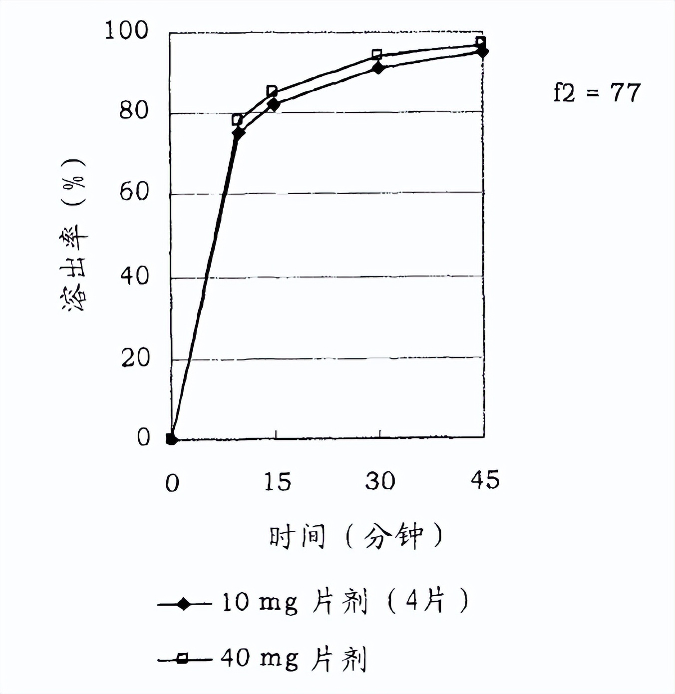 而其中“活性成分含量较低的多药片”作为现有技术,可以提供范围为5mg-40mg lurasidone/片相同溶出特性(见附图1)的口服制剂。故此,该专利的发明目的实际上是提供一种高含量lurasidone (如80mg以上)的口服制剂,通俗地讲,当该专利药剂中lurasidone 含量为80mg时,其药效相当于现有技术中lurasidone 含量为40mg药剂的两倍,简言之,即实现“一片抵现有技术两片”的效果。