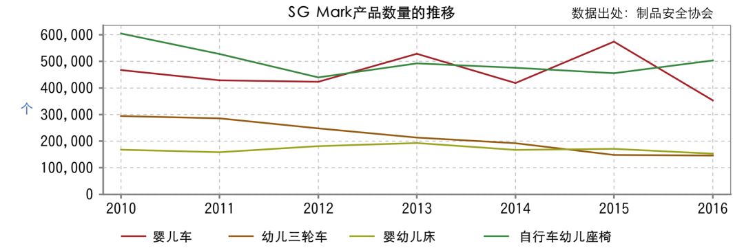 2010年,Aprica等企业注册的SG Mark婴儿车数量大幅增加。这主要来自于越来越多的中国企业首次注册SG Mark,也反映出日本市场上海外进口低价产品逐渐增多的趋势。从下图统计数据可以看出,虽然近年来SG Mark婴儿车总数有增有减,不过整体水平大致不变。此外,幼儿三轮车市场却不甚景气。