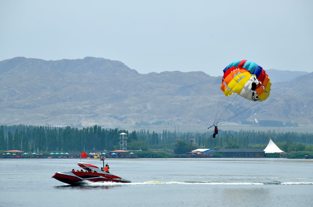 一位游客在乌梁素海景区体验水上项目。摄影/章轲