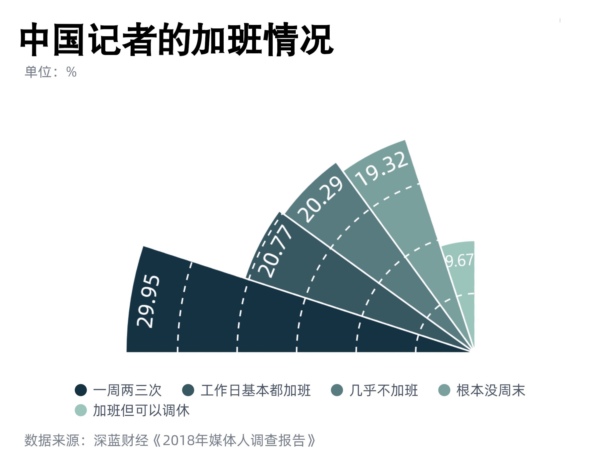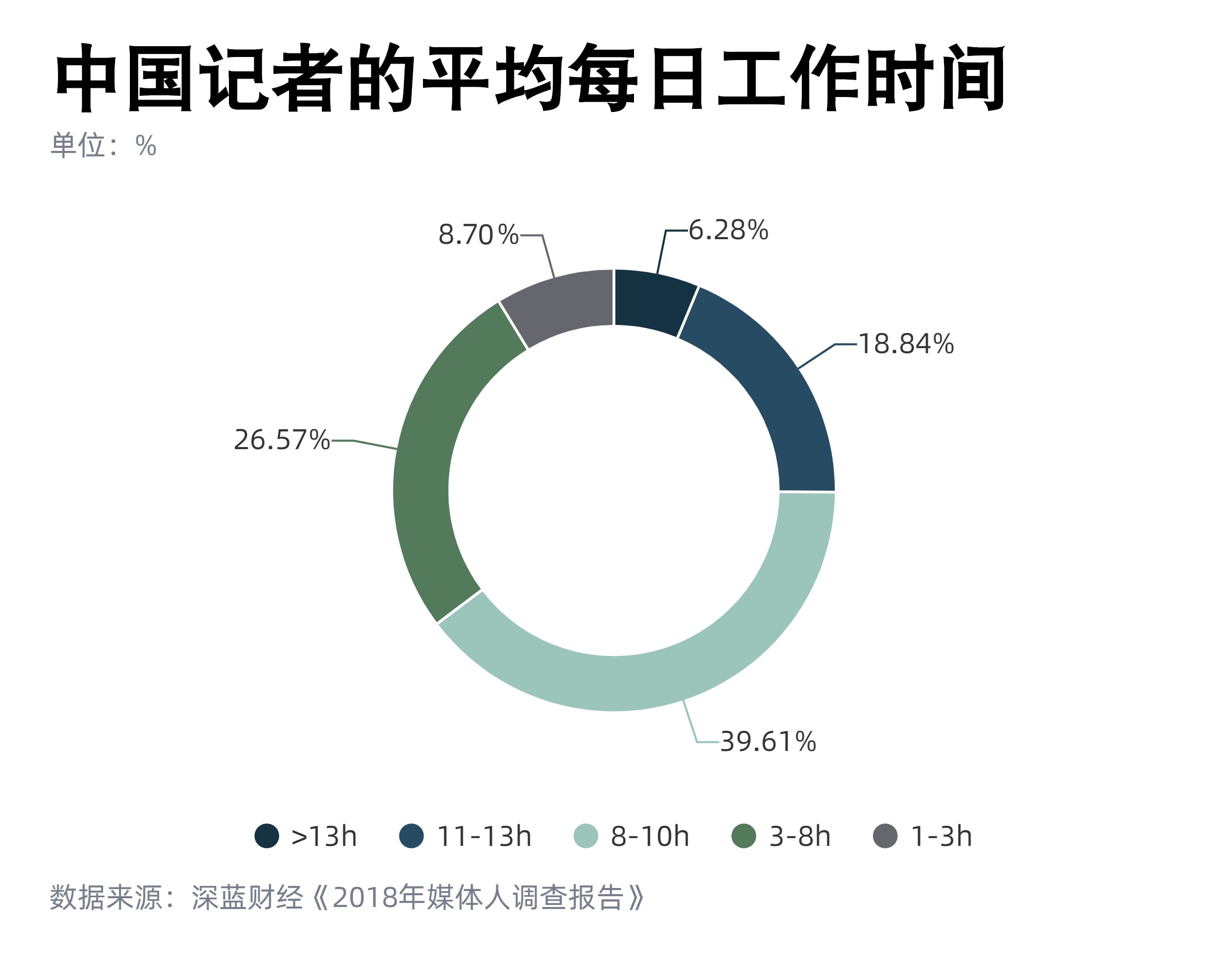 据深蓝财经统计,超过六成(64.8%)的记者平均每天工作8小时以上,四分之一(25.1%)的记者平均每天工作11小时以上。有记者接受采访时调侃道:“我有一个梦,就是有时间做一个梦。”