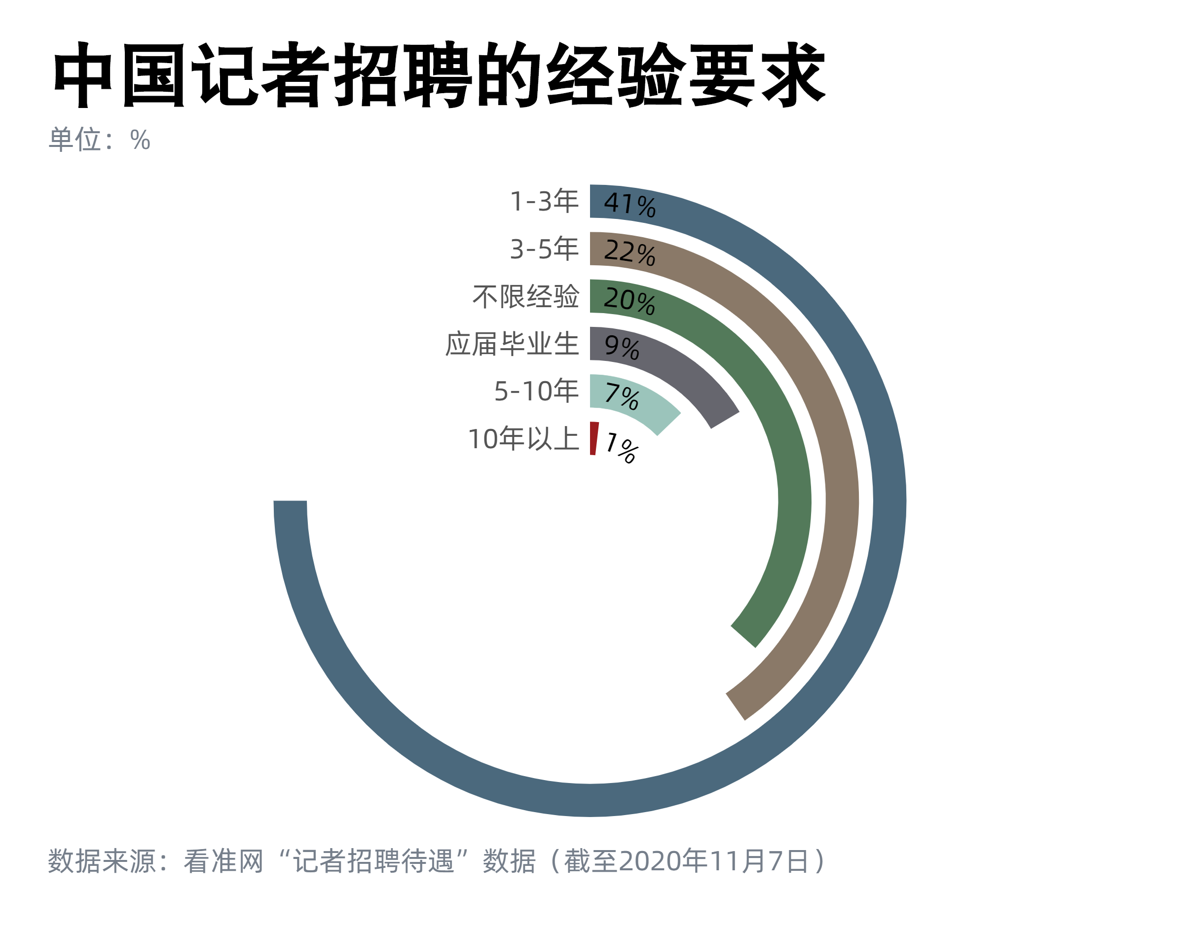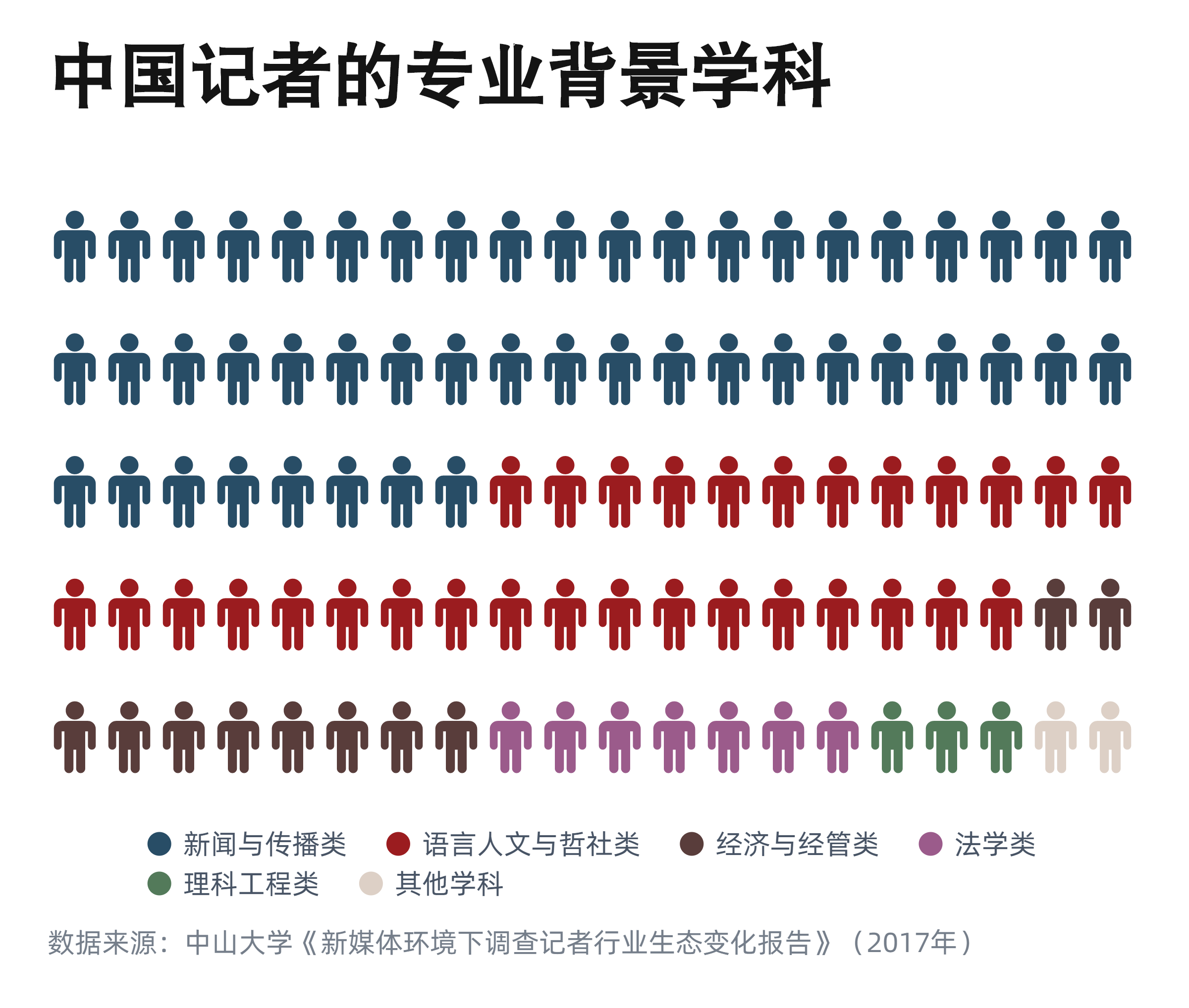 根据中国记协的统计,中国记者的受教育程度绝大多数为本科(72.2%)及以上学历,其次是专科学历(18.2%)。中山大学的报告显示,记者接受教育的专业背景学科更多来自新闻传播学,占比47.2%,其次是语言、历史、哲学等学科,占比30.1%。从业时长数据显示,中国记者平均从事新闻工作9.9年,平均从事调查报道的时间为6.5年,而首次调研时上述两项仅为8年和4.8年。在招聘要求里,媒体机构招聘有意愿招聘应届毕业生只占9%,多数机构(41%)青睐有1-3年工作经验的应征者。