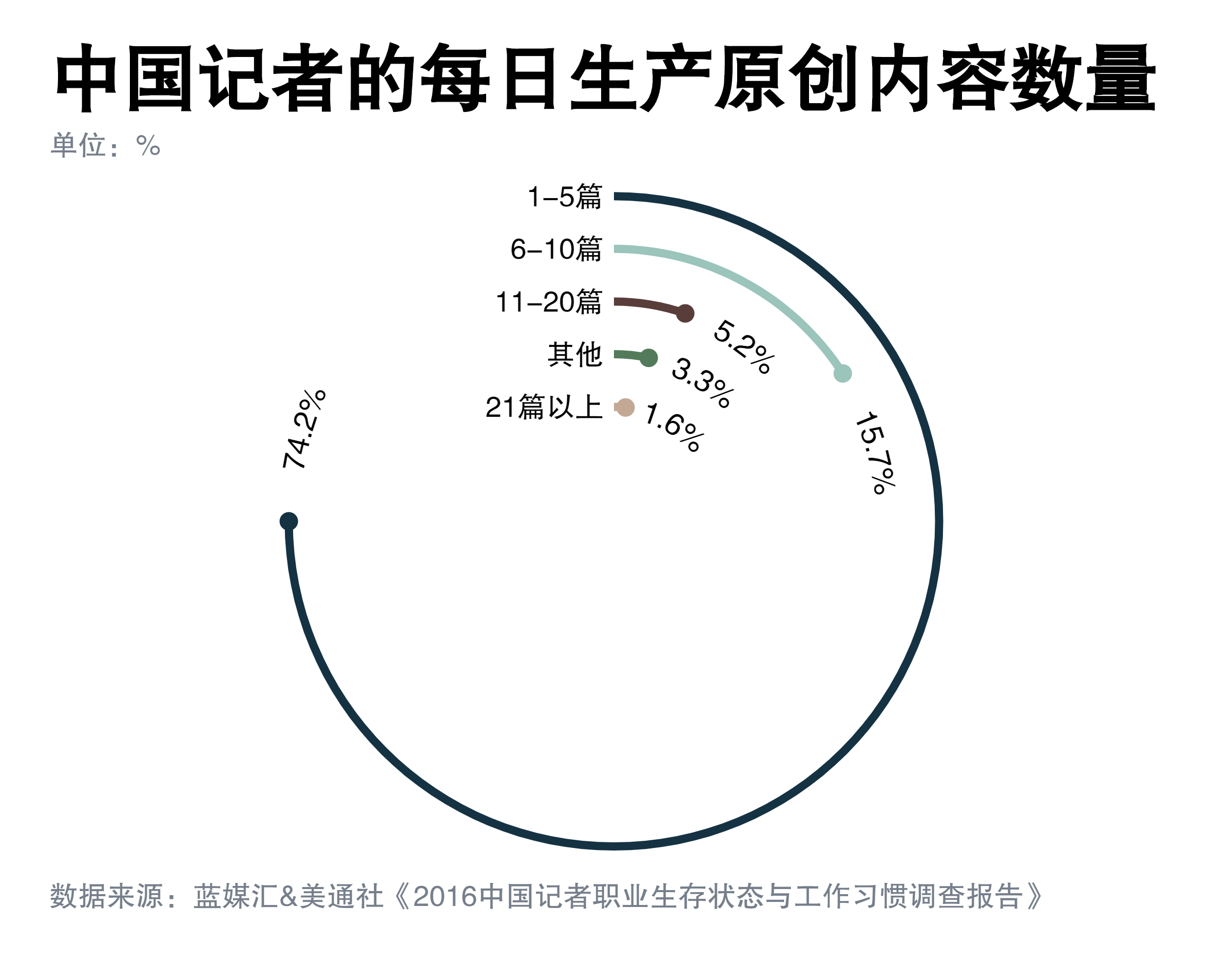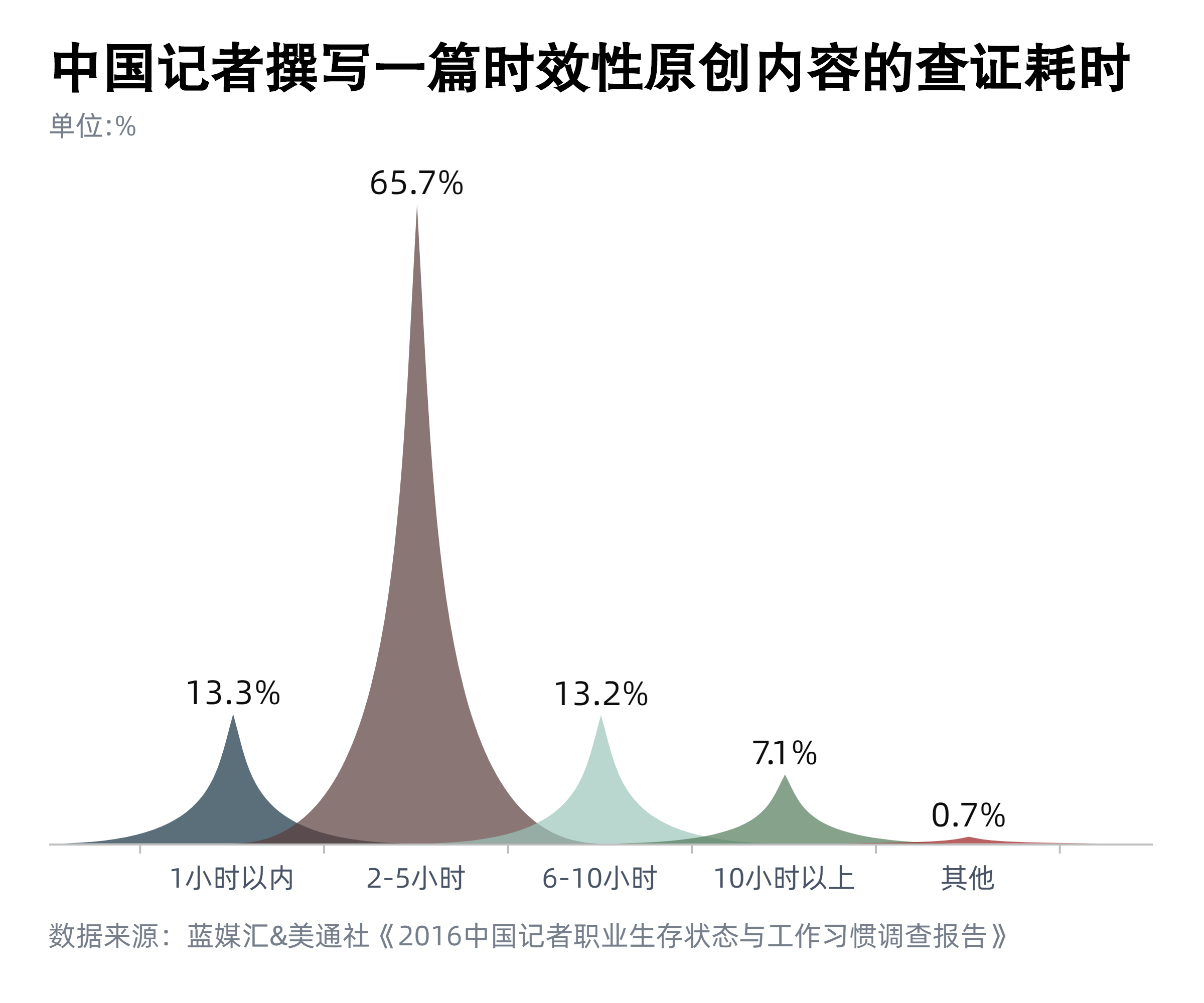 蓝媒汇&美通社报告数据表明,在中国,超过七成(74.2%)的记者每天生产原创内容1-5篇,生产6-10篇原创内容的记者占了15.7%。产出一篇合格的新闻报道,需要耗费大量的资料收集等准备时间,65.7%的记者为撰写一篇时效性原创内容所需要的查证时间为2-5小时。