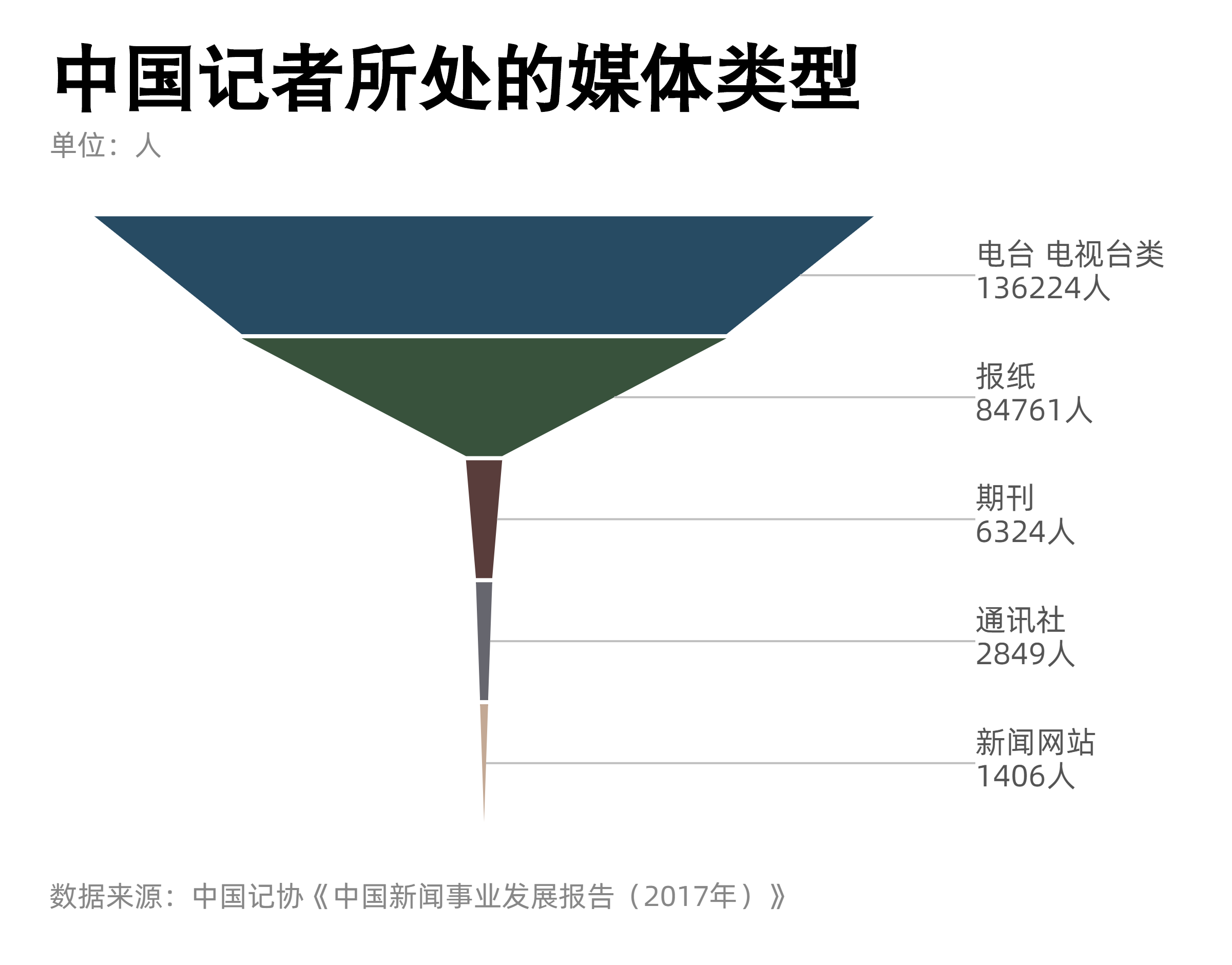 近年来媒介融合的纵深发展加速了传媒业版图的重构,但从现有资料判断,中国记者依然多选择在电台、电视台和报社等传统媒体就业。中华全国新闻工作者协会2017年发布的报告显示,持有国家新闻出版广电总局发放的具有采访资质的新闻记者证的记者汇总,电台、电视台类记者136224人,报纸记者84761人,期刊记者6324人,通讯社记者2849人,新闻网站记者1406人。