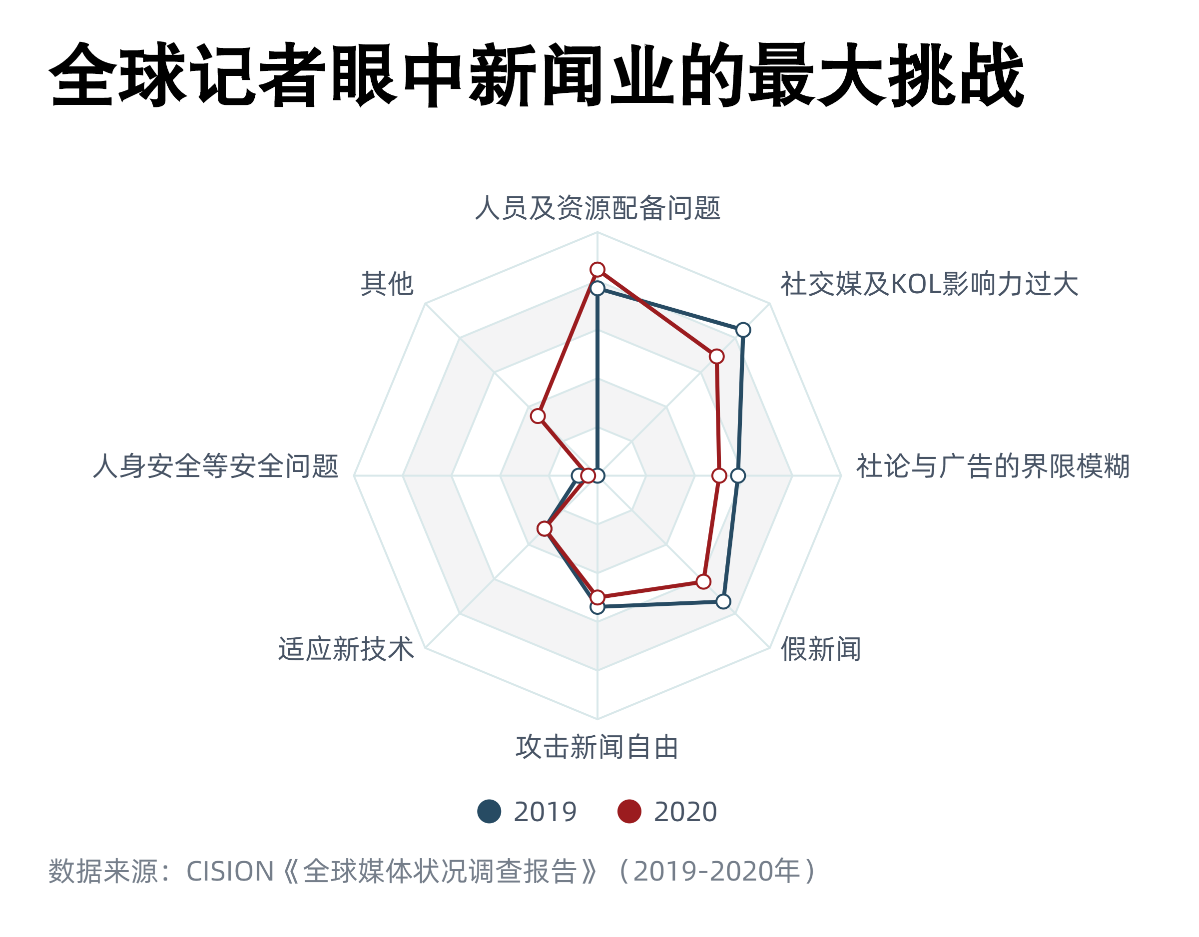 2020年度CISION全球媒体现状调查数据显示,当被问到“新闻业最大的挑战是什么”时,来自15个国家的3253位受访记者给出与2019年度相似的答案。
