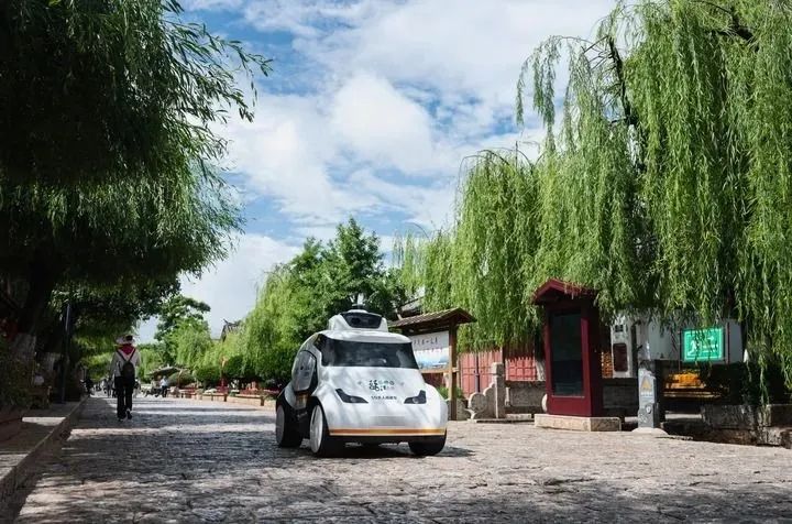 丽江古城5G无人巡逻车进行巡逻作业。(记者 王冠森 摄)
