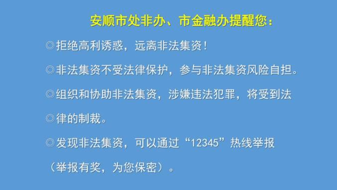 安顺市处非办、市金融办提醒您:拒绝高利诱惑,远离非法集资!非法集资不受法律保护,参与非法集资风险自担。组织和协助非法集资,涉嫌违法犯罪,将受到法律的制裁。发现非法集资,可以通过“12345”热线举报(举报有奖,为您保密)。