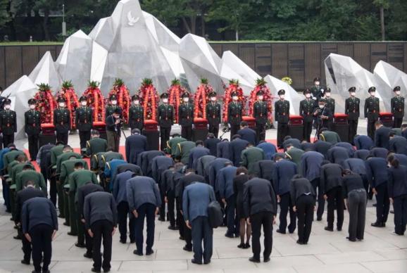 安葬仪式现场,全体人员向中国人民志愿军烈士遗骸三鞠躬。陶冉 摄
