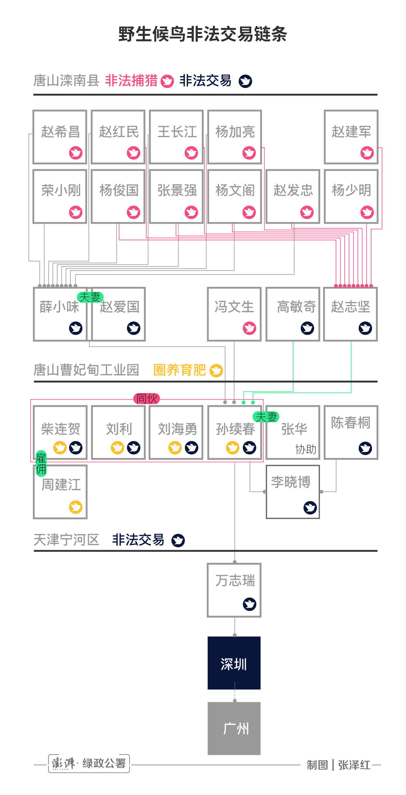 近日,中国裁判文书网公开的判决书(冀0209刑初91号、冀0209刑初97号)显示,在孙续春和柴连贺等人合伙从事的野生鸟类非法交易链条上,从非法捕猎、收购、圈养催肥再到售卖交易涉及至少24人;在唐山滦南县、秦皇岛被鸟网粘捕的野鸟被收购到曹妃甸圈养育肥,再被卖到天津的宁河区积攒到一定数量后通过天津滨海机场空运至深圳机场,再转运到广东,交易链条跨越了两千多公里,途经大半个中国。