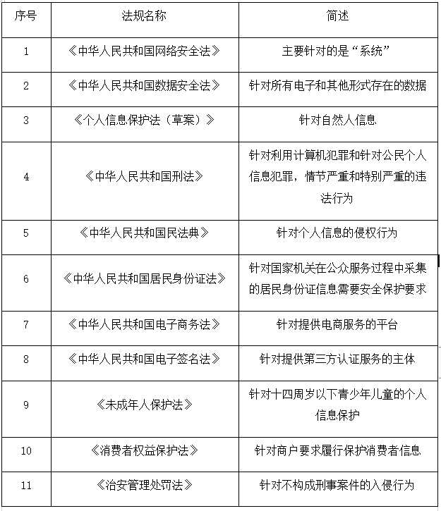 在现行的法律中,除《数据安全法》外,国家已出台多部涉及数据安全内容的法律法规,以下是小编收集整理的相关信息,并附上简要的描述,供大家快速匹配和理解: