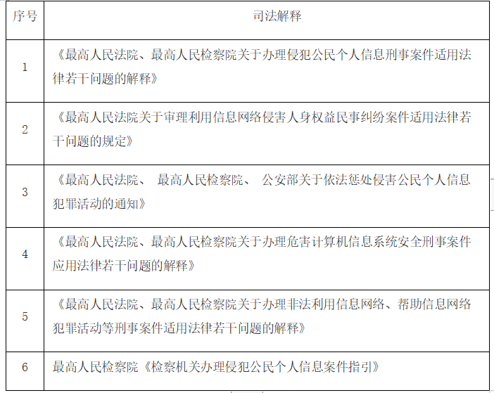 下表为国家最高司法机关在适用数据安全相关法律过程中,对具体法律问题所作的司法解释: