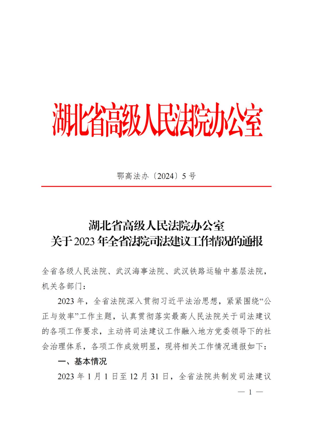司法建议工作是人民法院践行习近平法治思想、落实“抓前端、治未病”理念、积极参与社会治理、从源头上预防和减少纠纷的重要抓手。2023年,湖北法院深入贯彻落实习近平法治思想,自觉履行司法建议职责,对在审判执行工作中发现的社会管理普遍性问题,通过发送司法建议的方式指引有关单位采取措施及时改进工作、完善管理,依法有效延伸了审判职能,切实推动相关部门和行业领域提升管理决策水平和风险化解能力,涌现出一批政治站位高、研判问题精准、对策建议实用、反馈落实到位的高质量司法建议。
