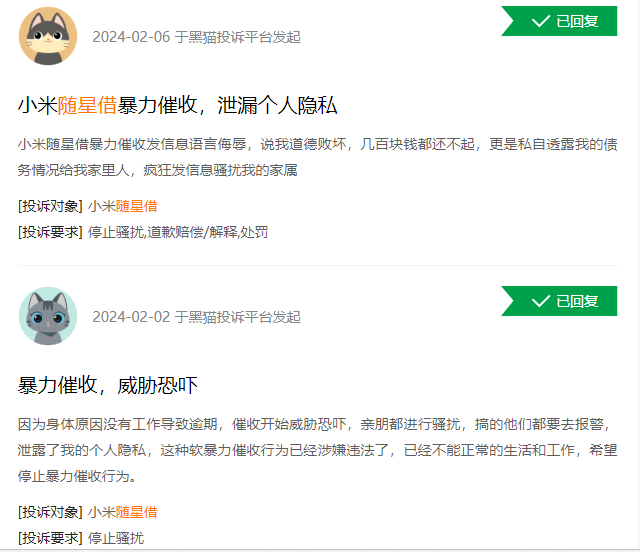 “小米随星借暴力催收发信息语言侮辱,说我道德败坏,更私自透露债务情况给家里人,疯狂发信息骚扰我的家人”。
