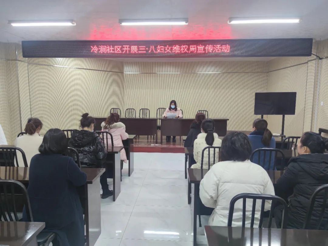 3月8日下午,冷涧社区妇联委员在社区会议室为社区群众妇女开展的维权活动进行讲解和说明。