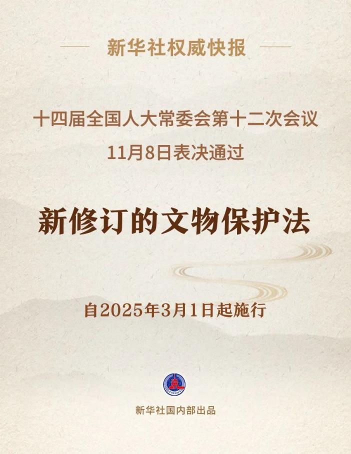 十四届全国人大常委会第十二次会议11月8日表决通过新修订的文物保护法,自2025年3月1日起施行。