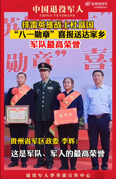 4.“八一勋章”喜报送达杜富国家乡:近日,贵州湄潭,“排雷英雄战士”杜富国的“八一勋章”喜报送达家乡。在送达仪式上,杜富国的父母收下喜报和慰问金。这是军队、军人的最高荣誉。向英雄致敬!(人民日报)