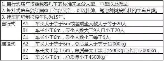 车辆类型:在交管部门所颁发的激动行驶证中,对于自行式房车叫法是不同的,有小型专项作业车、小型专用客车、专用客车、小型客车、特种车等等,但是对于所有具备床铺等正常生活起居设施的车辆都统称为旅居车。