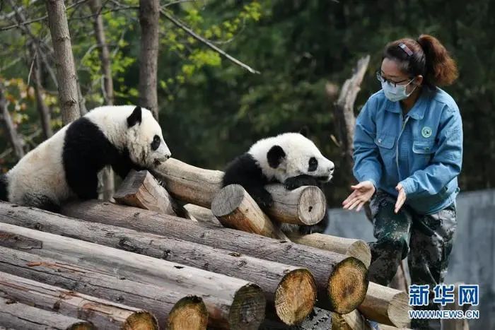 陕西省林业科学院秦岭大熊猫繁育研究中心,工作人员与大熊猫幼崽互动(3月31日摄) 新华社记者 张博文摄