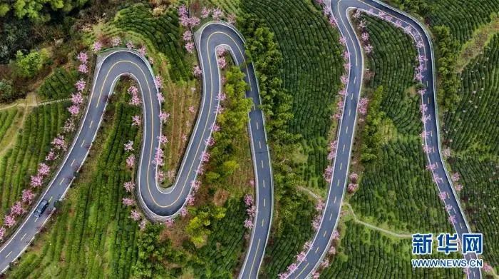 陕西平利县长安镇洪福茶山,道路两旁的春梅盛开(3月2日摄,无人机照片) 新华社记者 陶明摄