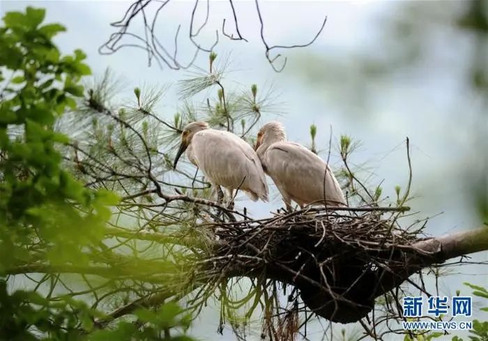 陕西宁陕寨沟两只新繁殖的朱鹮雏鸟在巢里等待被喂食(2012年5月31日摄) 新华社记者 李一博摄