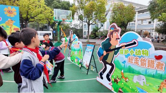 在崧泽学校篮球场上,学生们共同在承诺墙上张贴守护绿水青山、保护野生动物的小贴纸,工作人员则向大家发放了野生动植物保护宣传册。现场设置了“赶走偷猎者”“动物圈圈乐”“候鸟大迁徙”等多个游戏环节,让学生们在寓教于乐中了解自然、对野生动物有了更深刻认识,了解上海被誉为“建在湿地上城市”的意义,进一步增强保护湿地及野生动物的责任意识,提升野生动物保护法律法规知晓率。