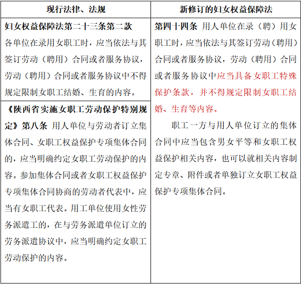 新修订的妇女权益保障法首次以法律形式规定了用人单位与女职工签订的用工合同中必须具备女职工特殊保护条款,系对劳动合同法中规定的劳动合同必备内容的补充。