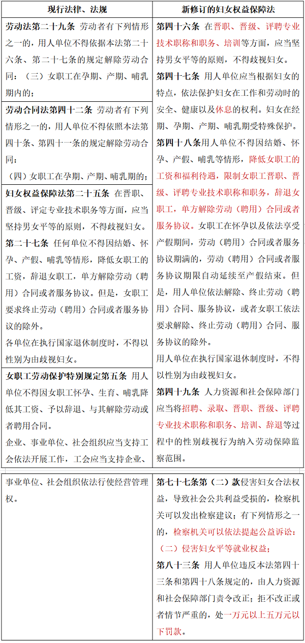 相较现行劳动法、劳动合同法、妇女权益保障法、女职工劳动保护特别规定等,新修订的妇女权益保障法更聚焦女性职场公平,进一步明确对女职工福利待遇、休息、晋职、晋级、评聘专业技术职称和职务的保障,确保女职工有和男性员工同等的竞争机会。增设就业歧视救济机制,明确将就业性别歧视纳入劳动保障监察范围。对于侵害妇女平等就业权益的相关用人单位还有可能面临检察机关的检察建议或被提起公益诉讼。