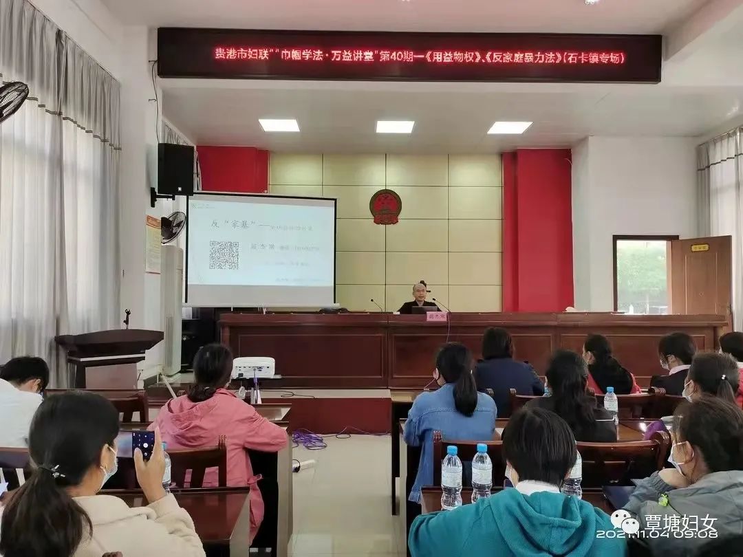 家庭暴力的存在由来已久,因婚姻家庭矛盾纠纷引发的个人极端案事件时有发生,为增强广大群众对家庭暴力危害的认识和妇女自我保护意识,加强反家庭暴力法律法规的宣传,近日,贵港市妇联联合覃塘区妇联、广西万益(贵港)律师事务所在覃塘区石卡镇政府组织开展“巾帼学法,万益讲堂”宣讲活动,覃塘妇联主席蒋礼艳、副主席林海珠,石卡镇党委副书记马崇欢、各村妇联主席和当地群众80余人参加了本次活动,本次活动以讲座形式开展。