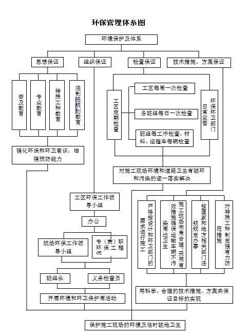 贯彻执行《环境管理体系-规范及使用指南》(GB/T24001-2004),针对工程及环境特点,从人、机、料、法、环、测六个方面,建立完整的环境保护和保证体系,保证环保管理体系的有效运行。详见“环境保护和管理体系图”。