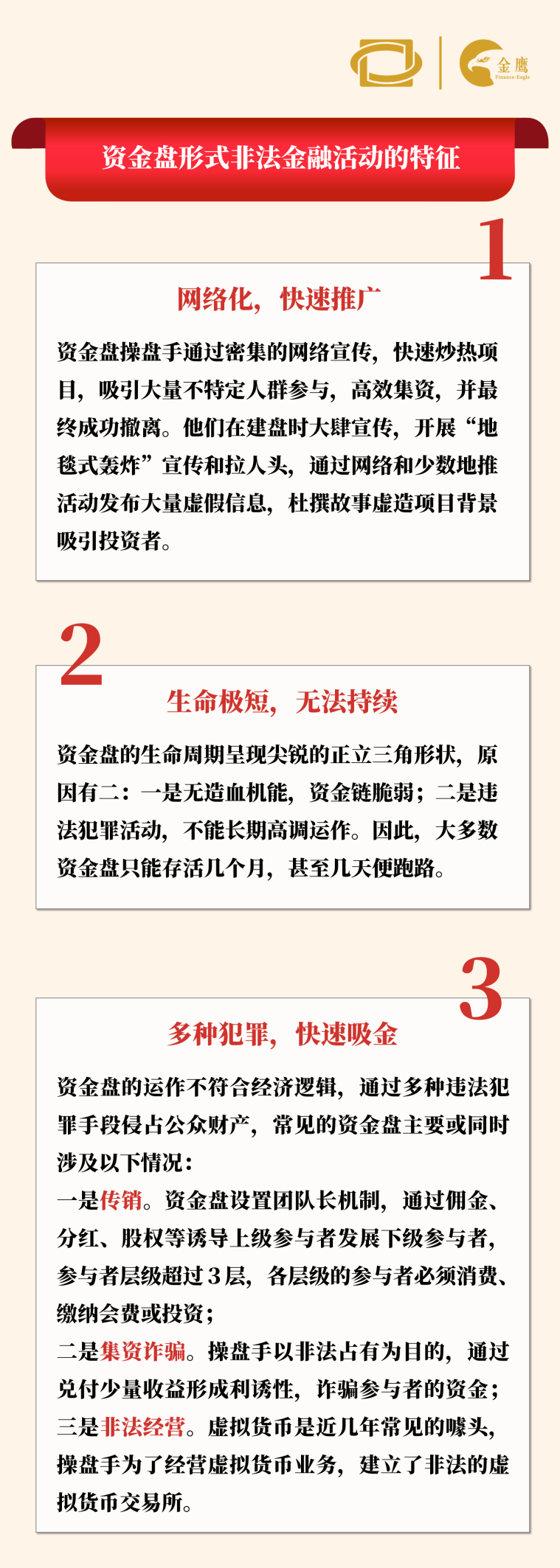 资金盘是非法侵占财产的突出乱象,具有网络化、快速敛财、非法性、利诱性、涉众性和跨地域等特点。虽然组织结构不如大型非法集资或传销严密,但其数量多、花样翻新,对公众具有迷惑性和吸引力,传染能力强。