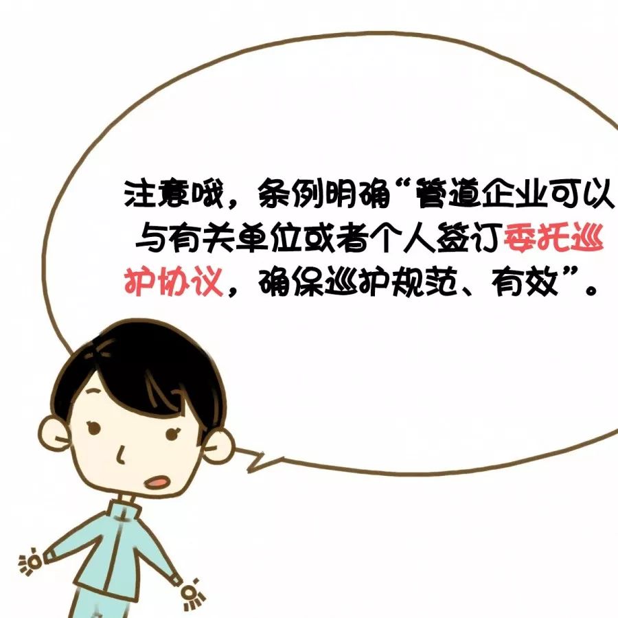 鼓励管道沿线的单位或者个人参与管道保护工作。管道企业可以与有关单位或者个人签订委托巡护协议,确保巡护规范、有效。