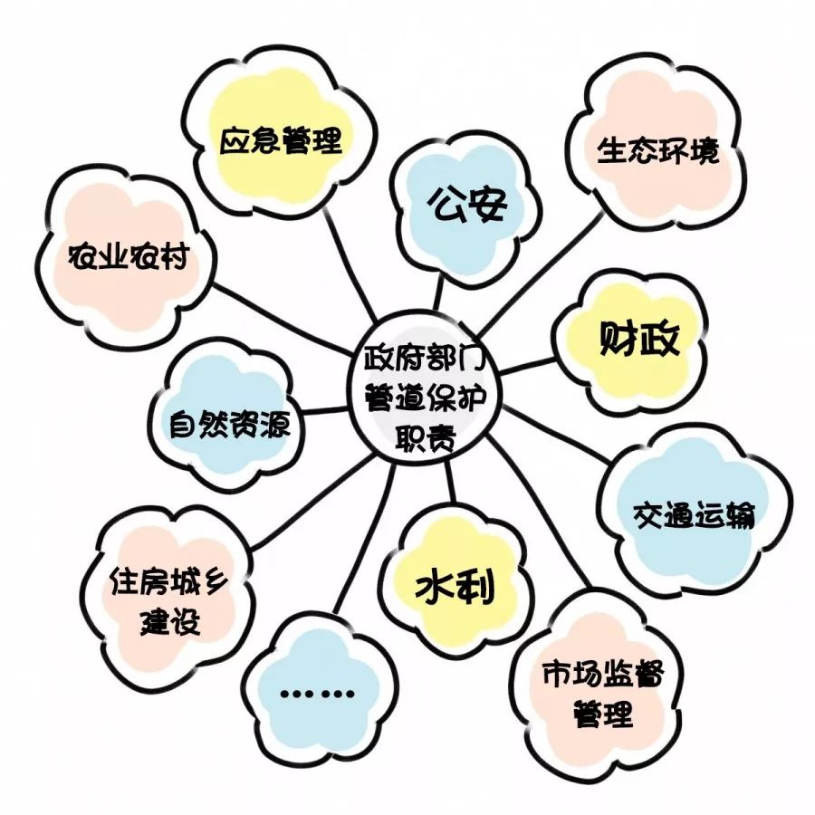 公安、财政、自然资源、住房城乡建设、交通运输、农业农村、水利、生态环境、应急管理以及市场监督管理等部门,应当按照职责分工做好管道保护的相关工作。