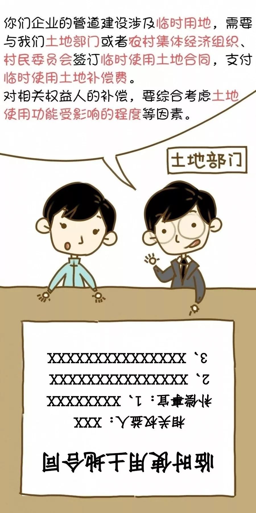 管道建设涉及临时用地的,土地使用者应当根据土地权属,与有关土地行政主管部门或者农村集体经济组织、村民委员会签订临时使用土地合同,支付临时使用土地补偿费,并在合同中列明相关权益人,告知相关权益人有关补偿事宜。